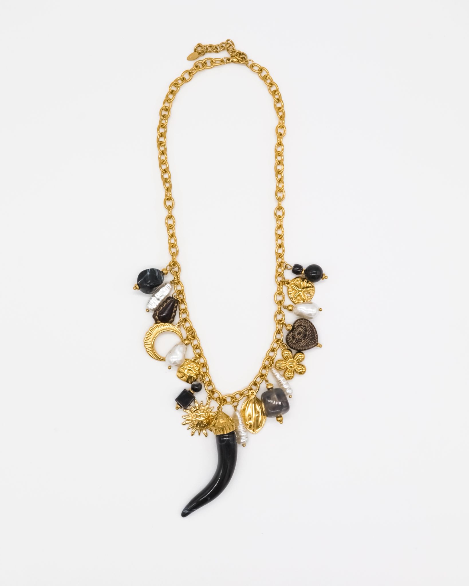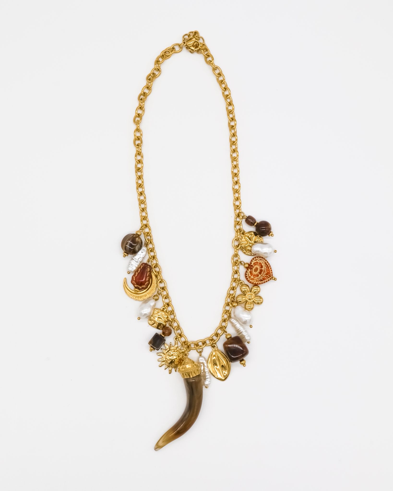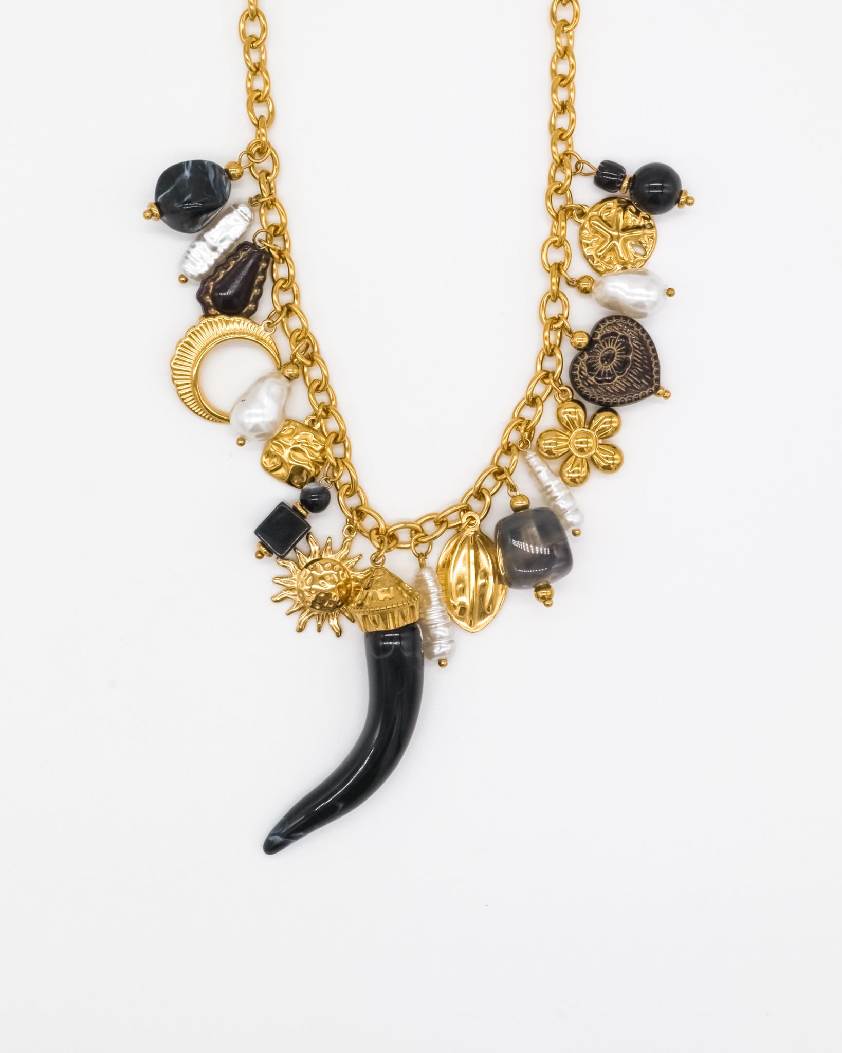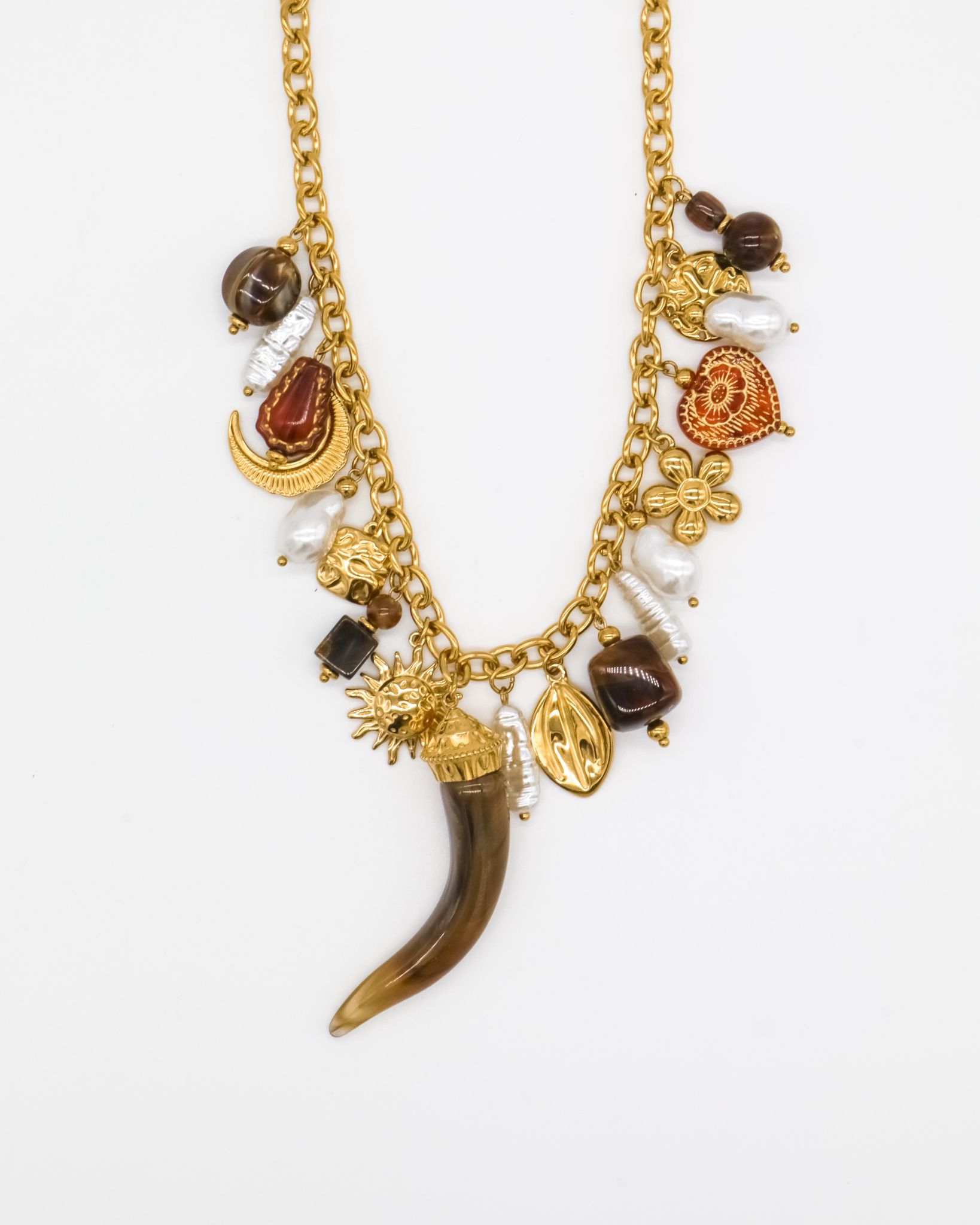 Colar em aço inoxidável com pendentes em pérola de água doce e pedras semi preciosas.