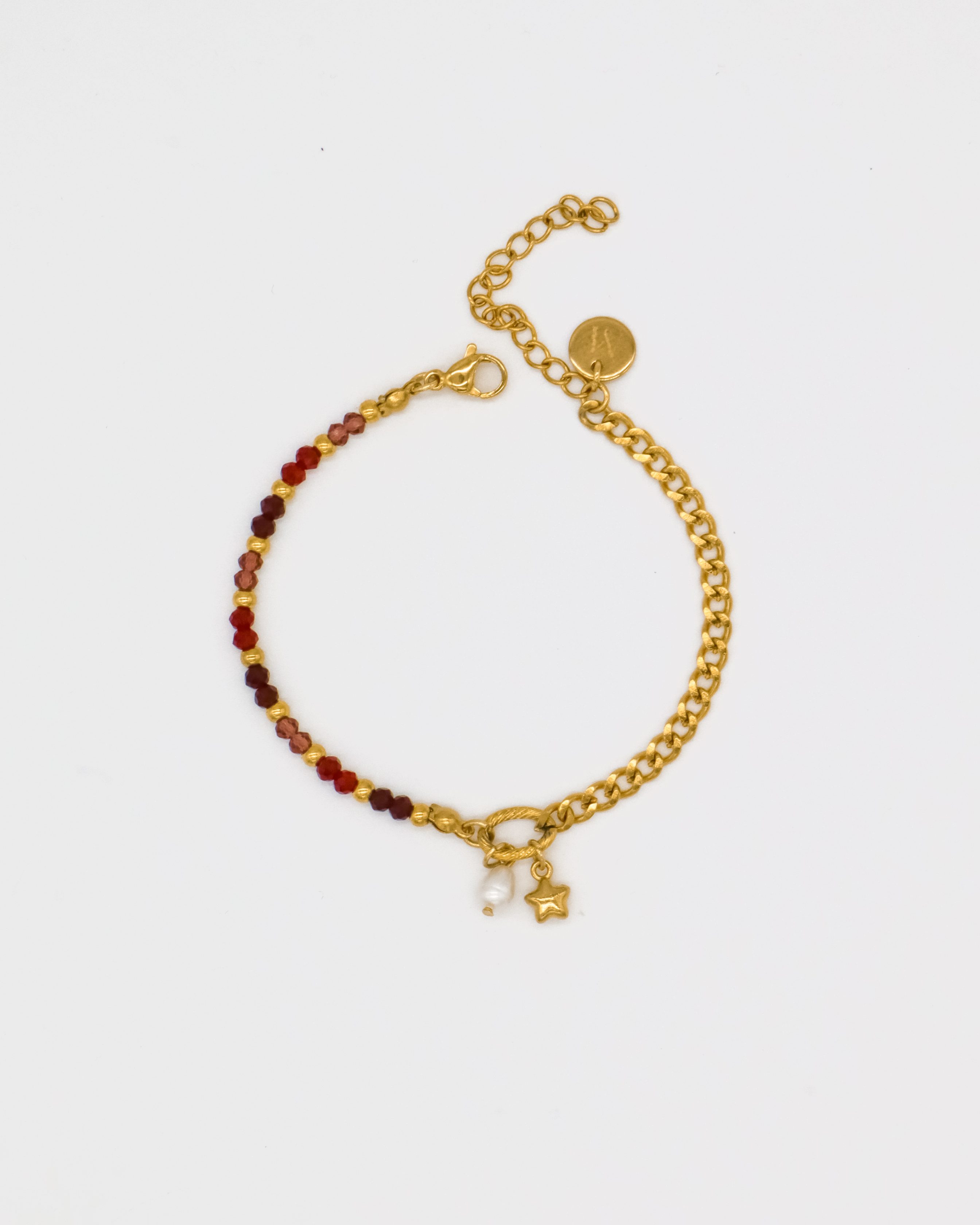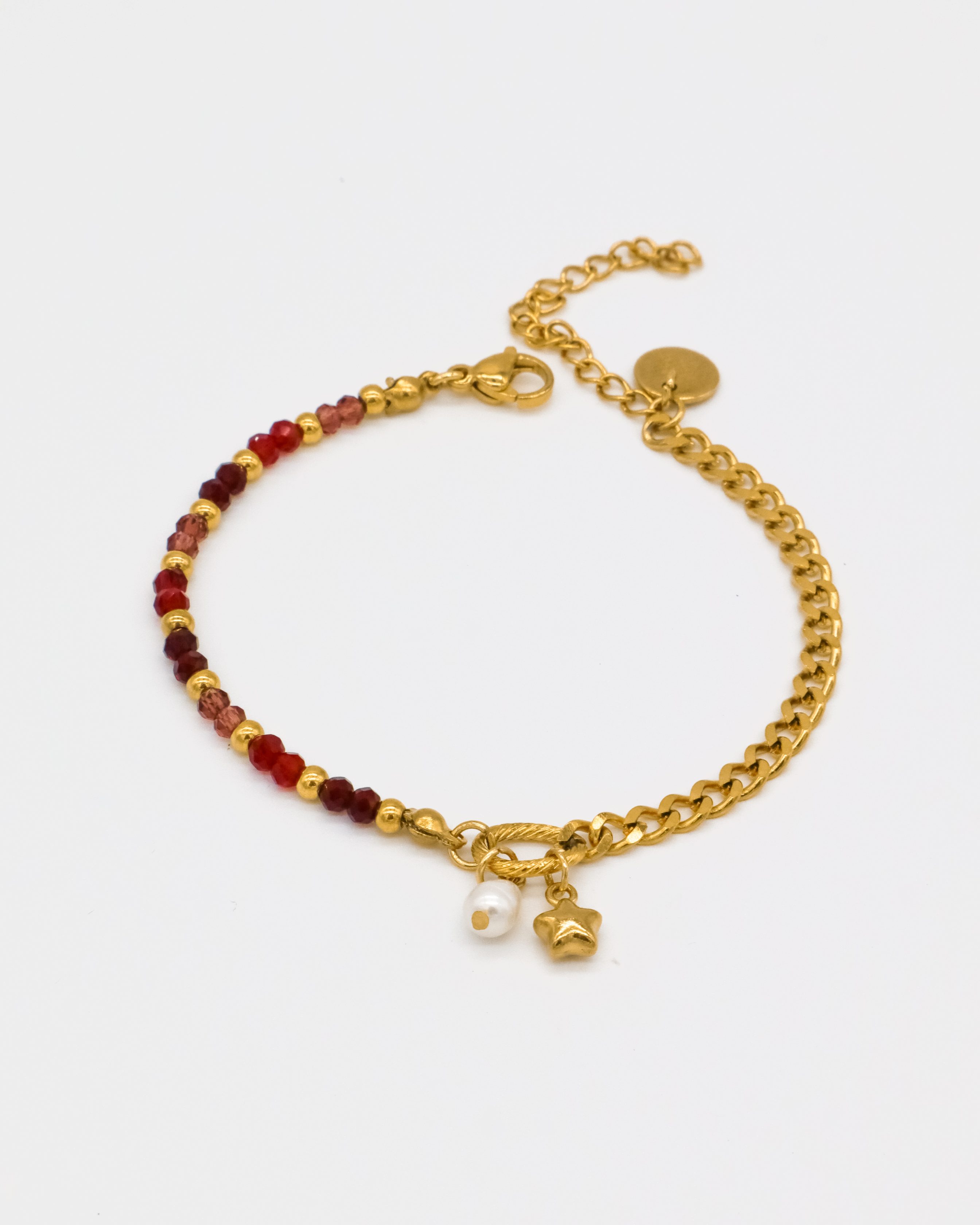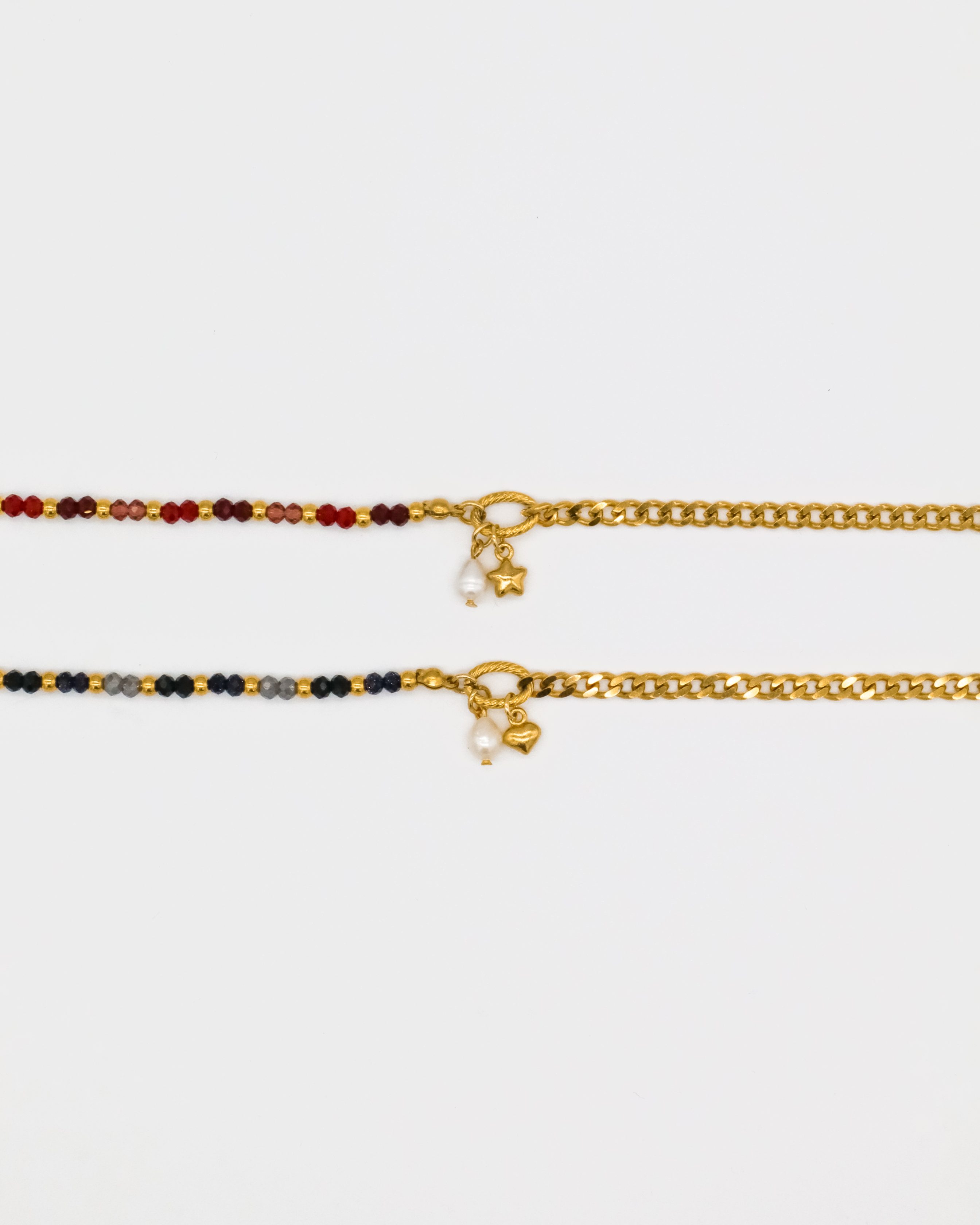 Pulseira em aço inoxidável com pedras semipreciosas. Acabamentos em e pendentes em aço inoxidável.
