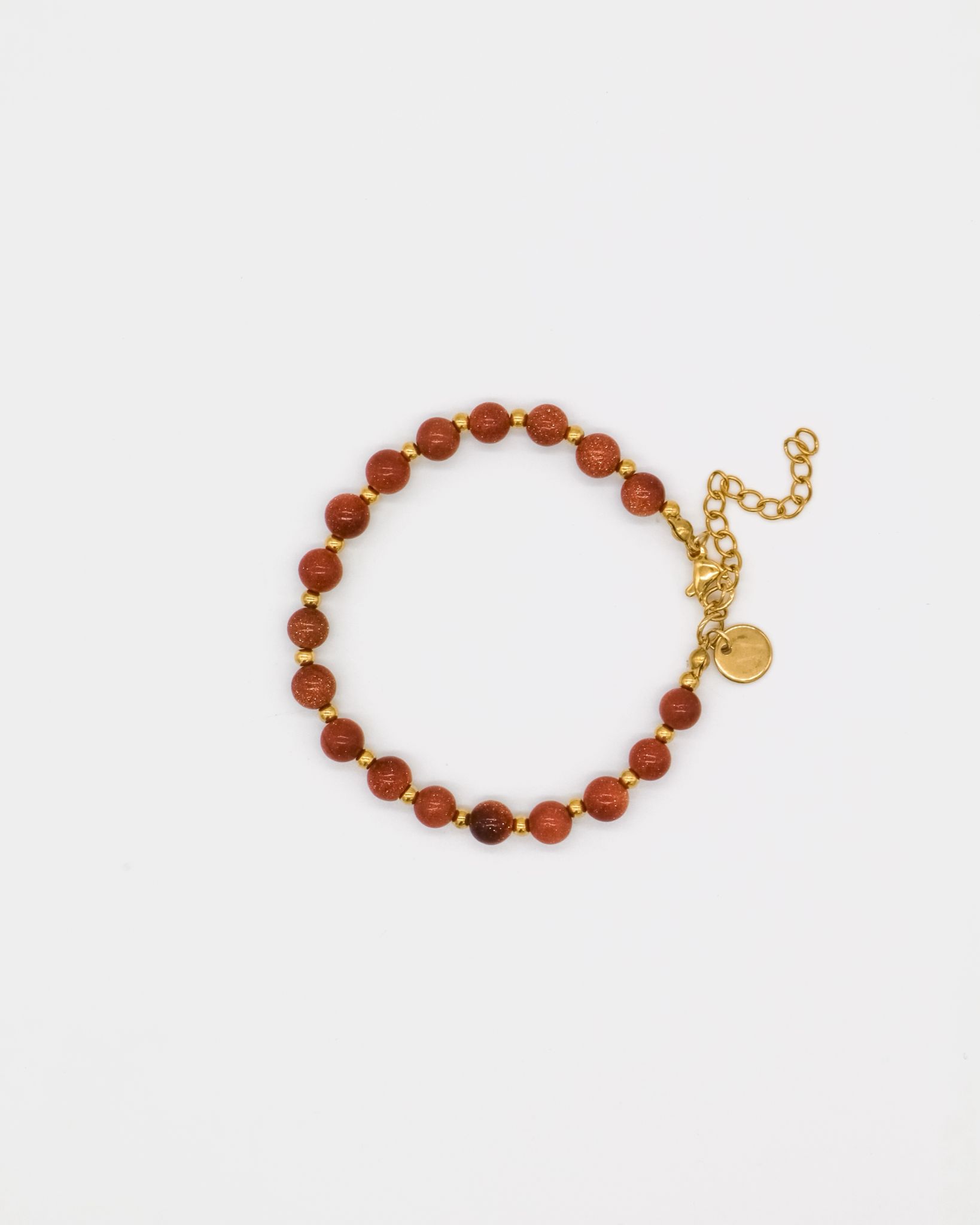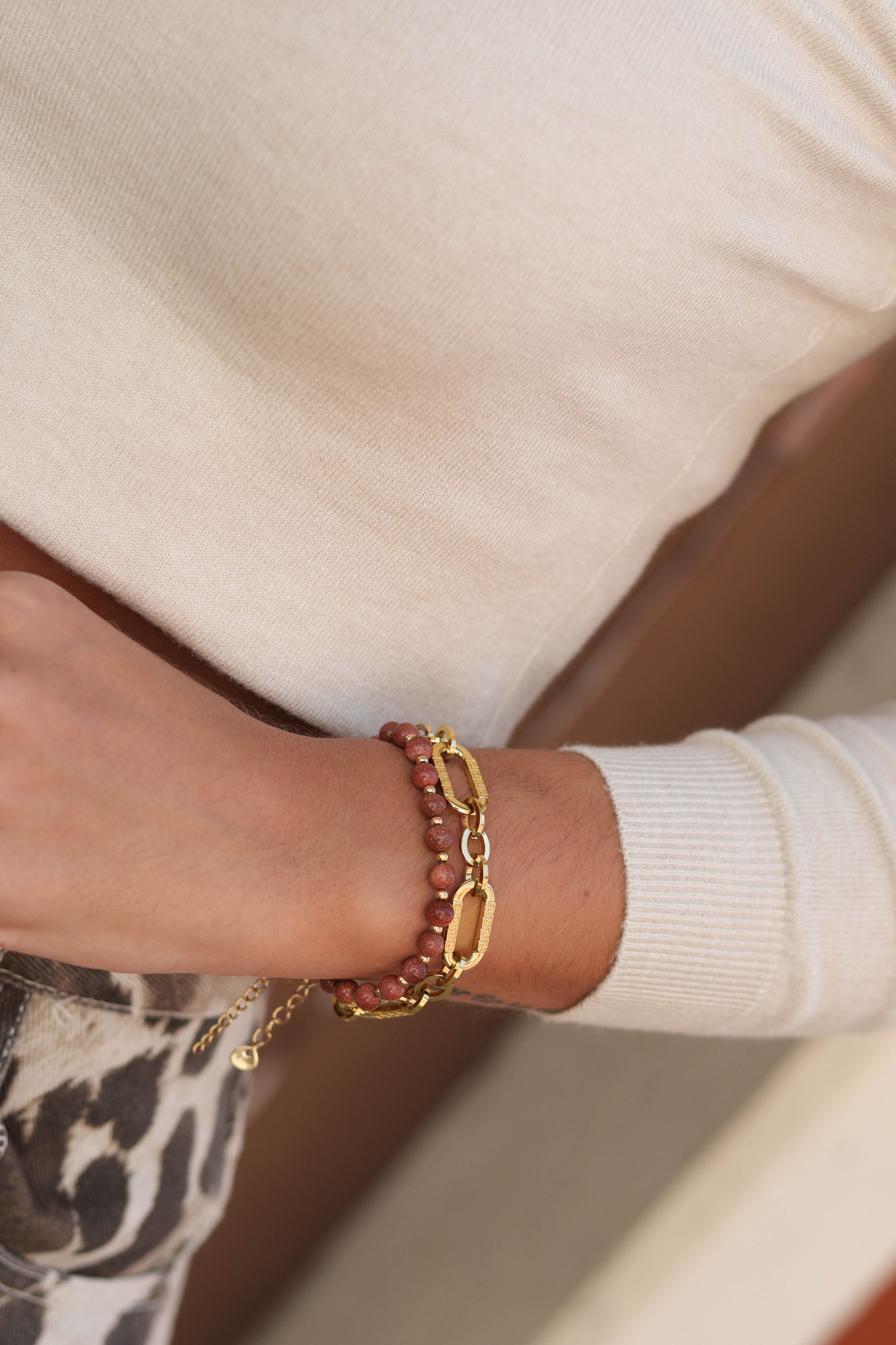 Pulseira com pedras frias com acabamentos e missangas em aço inoxidável.