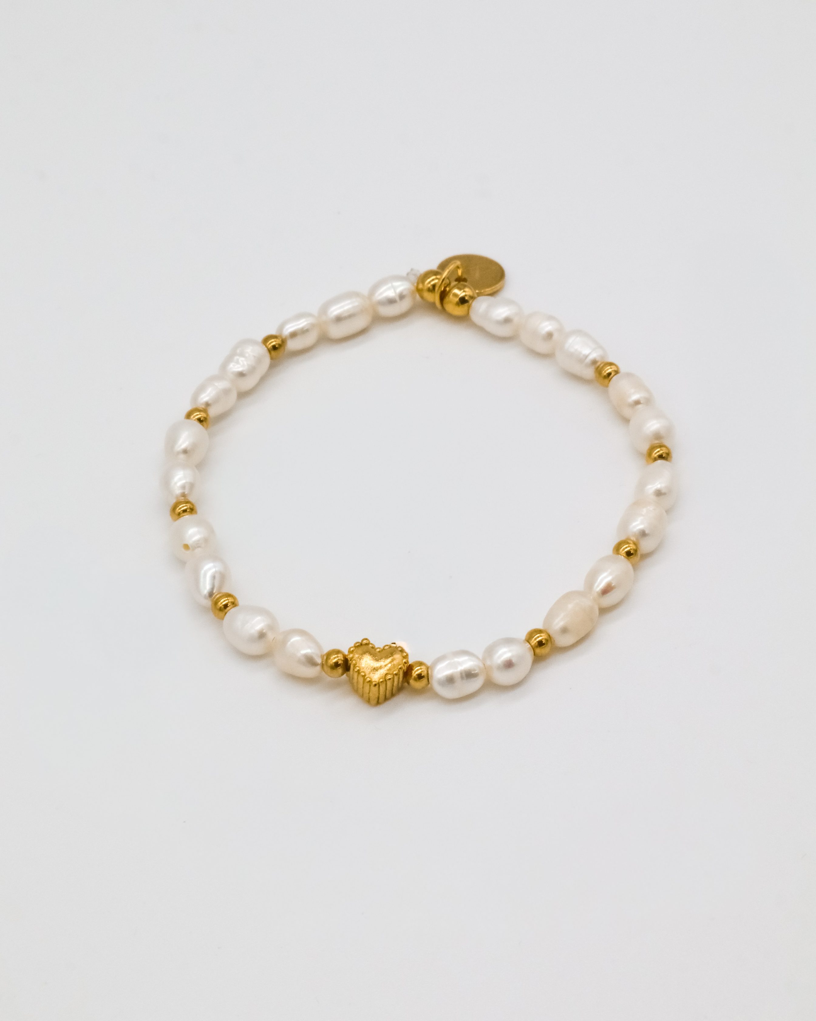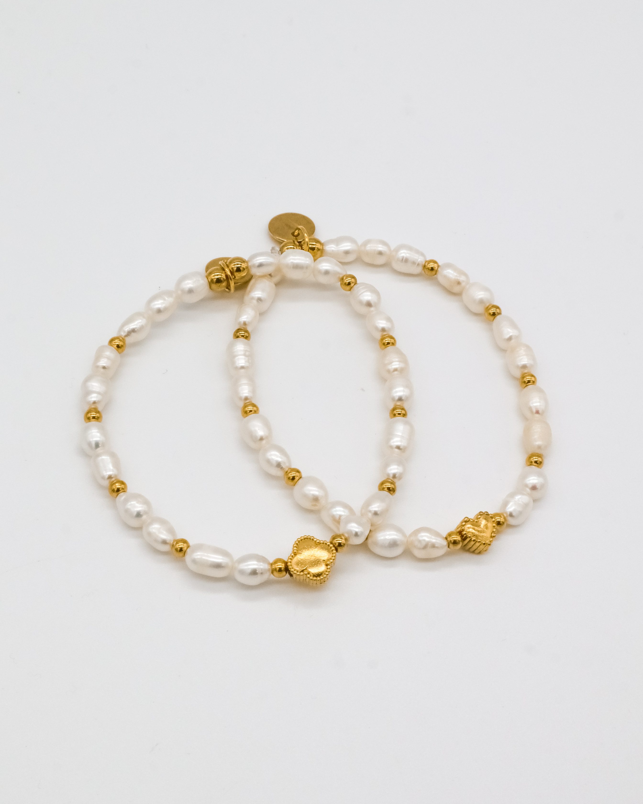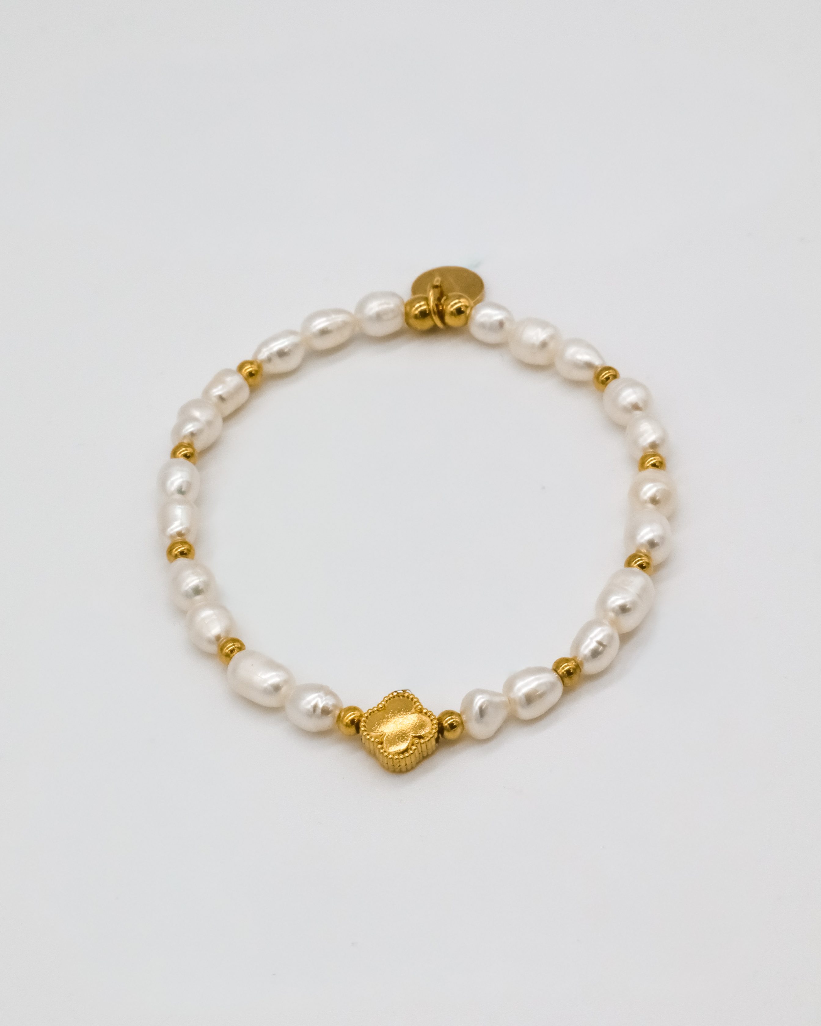 Pulseira em elástico em pérolas de água doce com missangas e acabamentos em aço inoxidável.