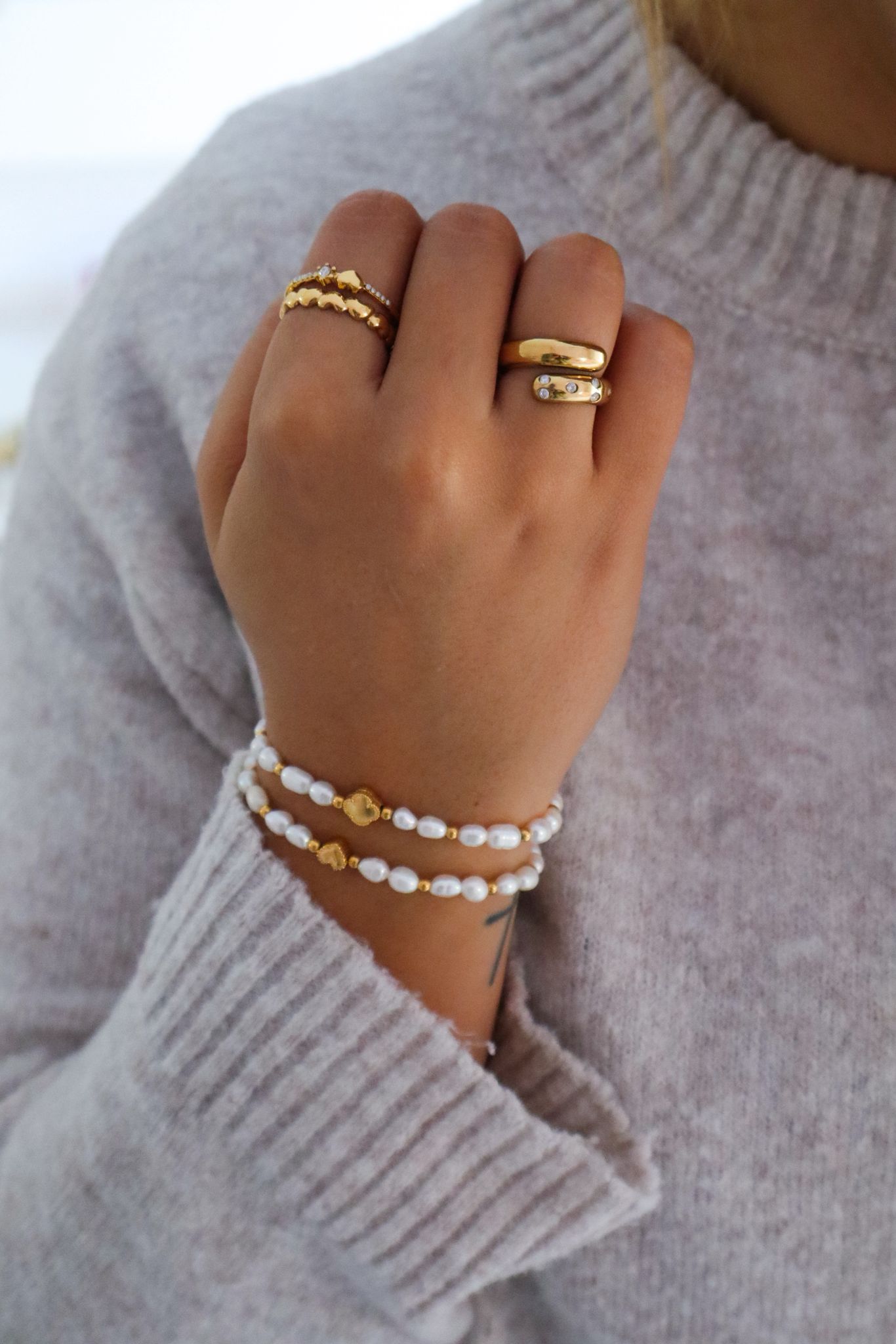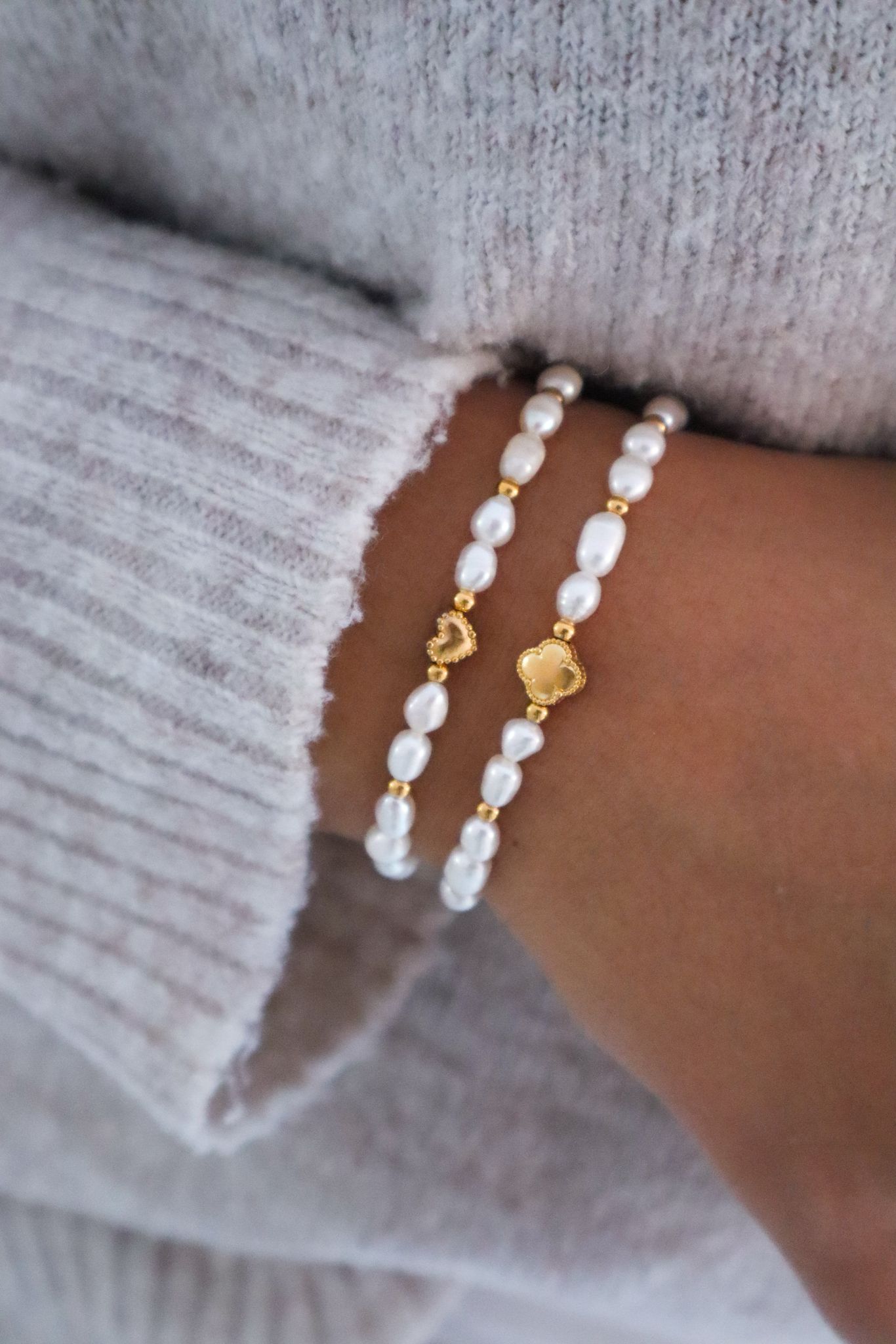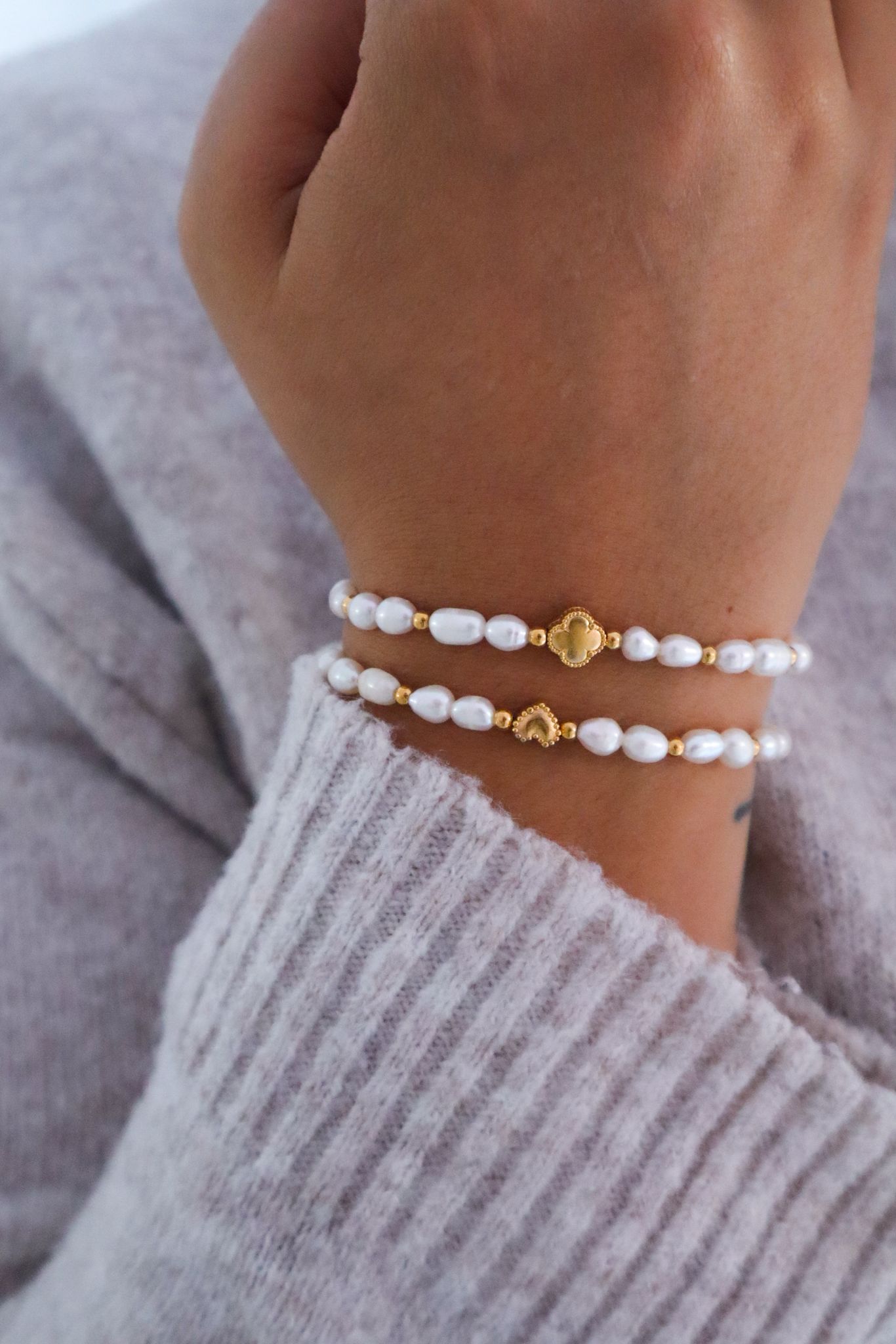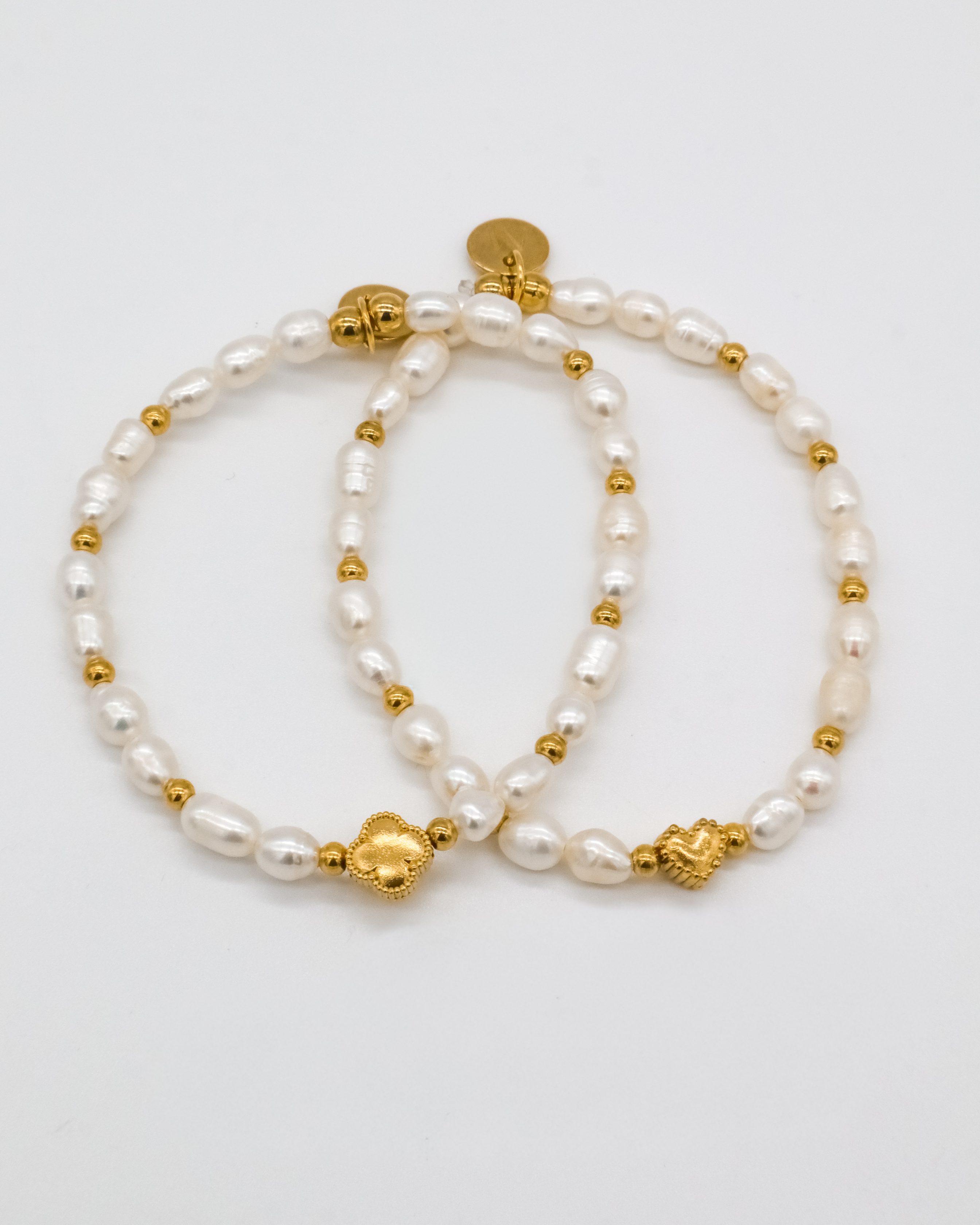 Pulseira em elástico em pérolas de água doce com missangas e acabamentos em aço inoxidável.