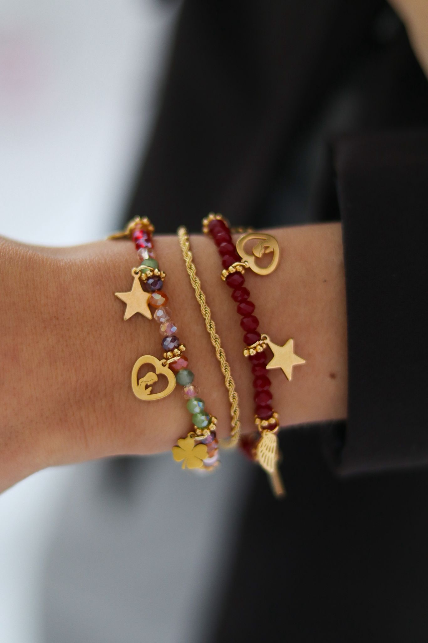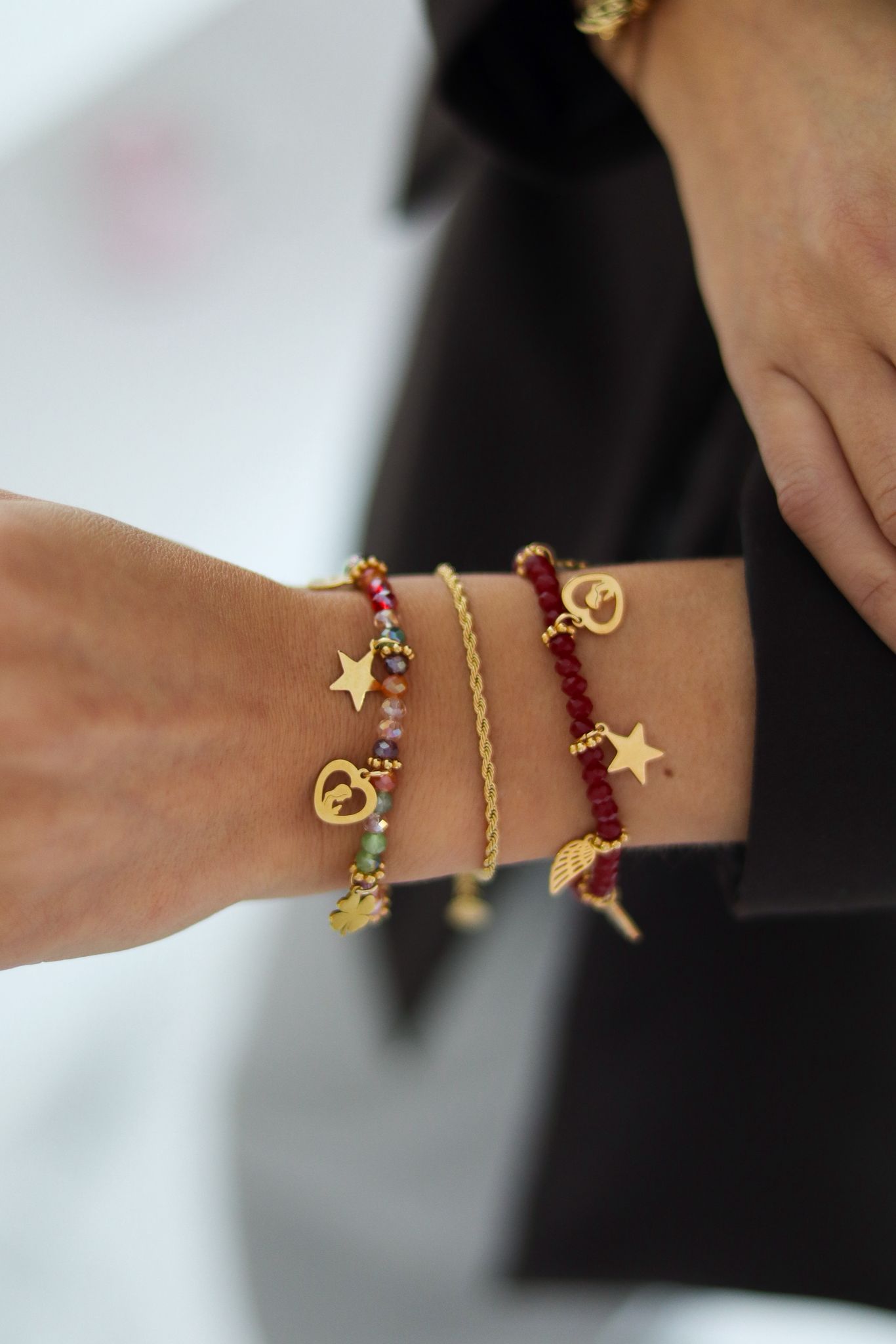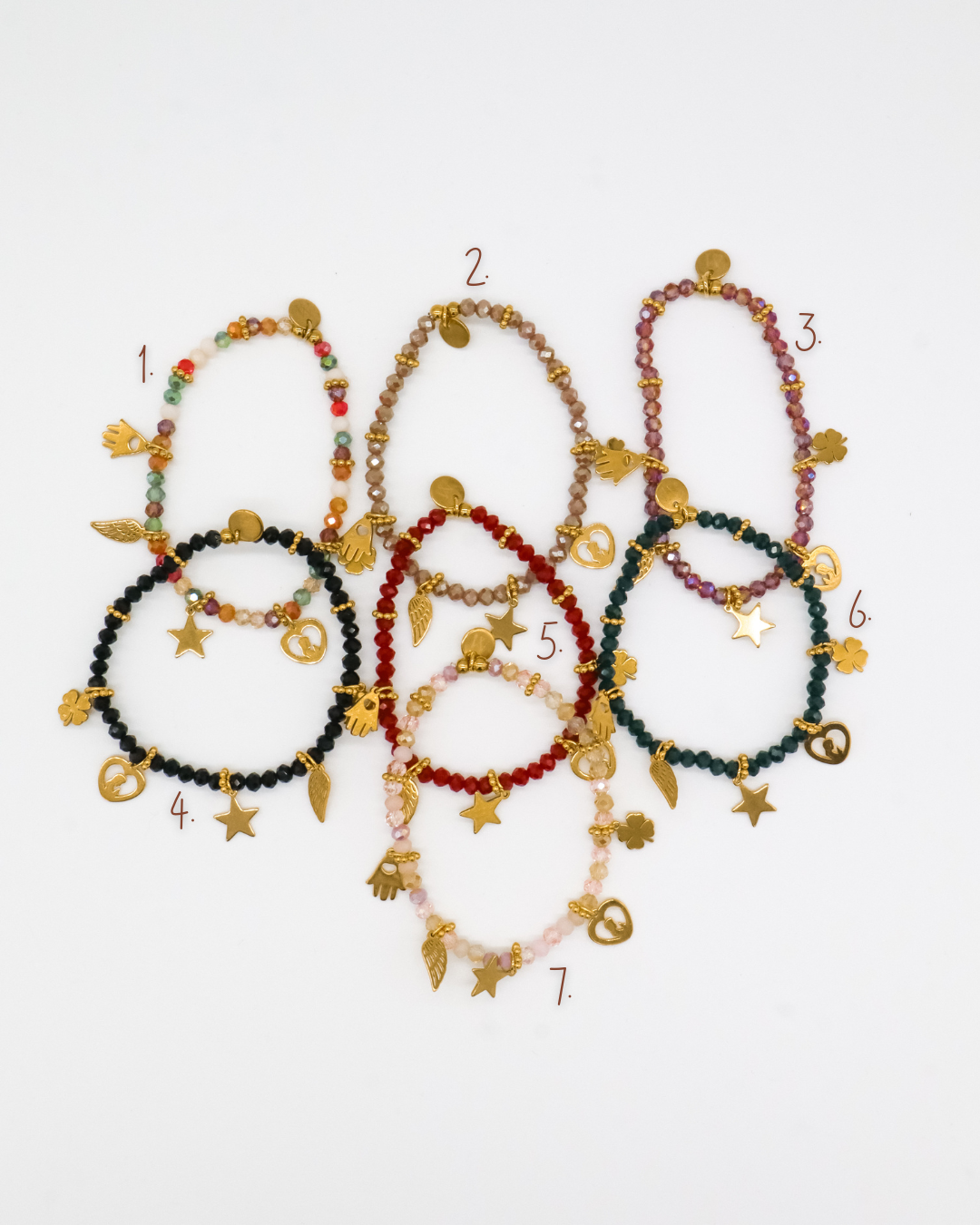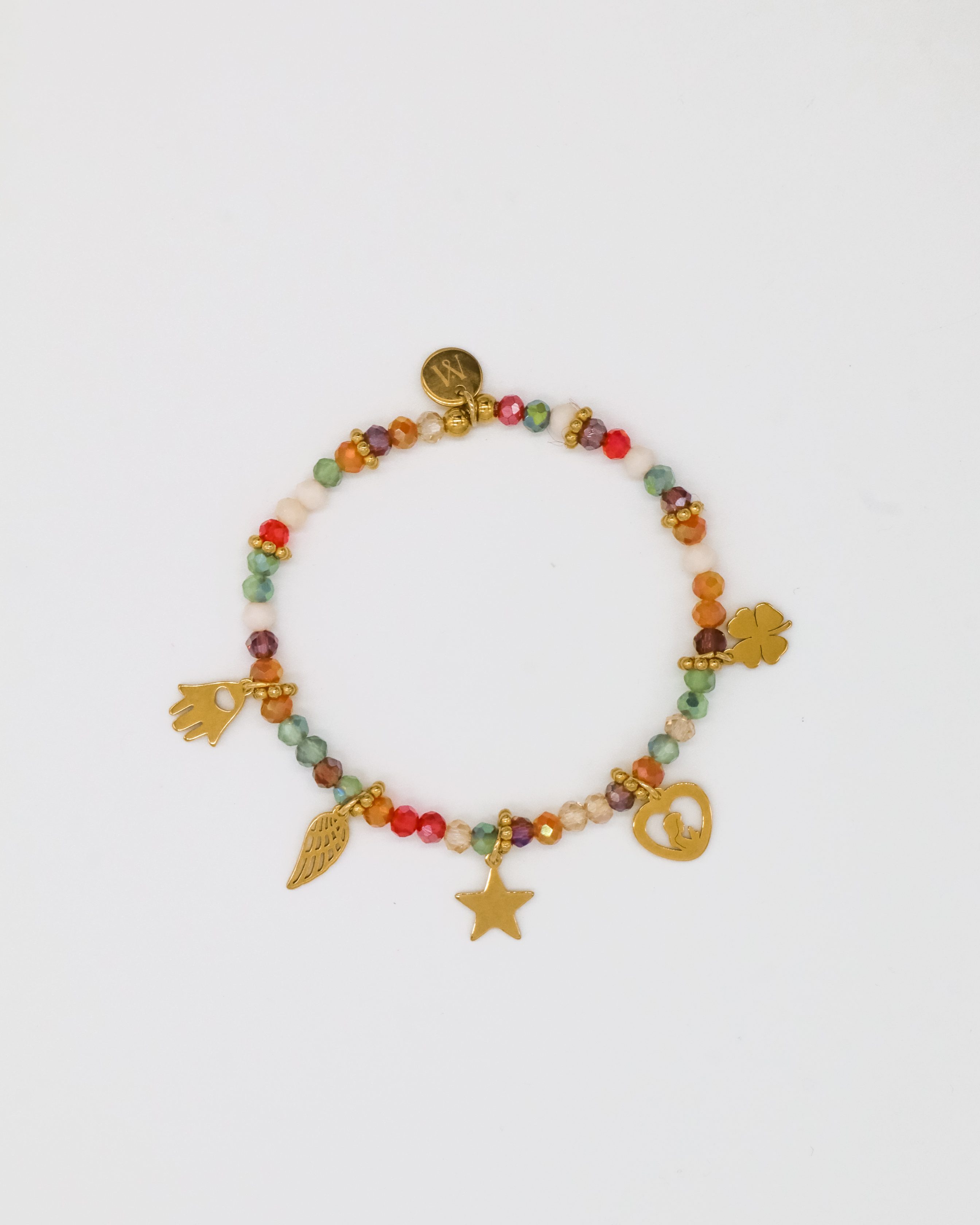 Pulseira em elástico com pedras semipreciosas, com acabamentos e pendentes em aço inoxidável.