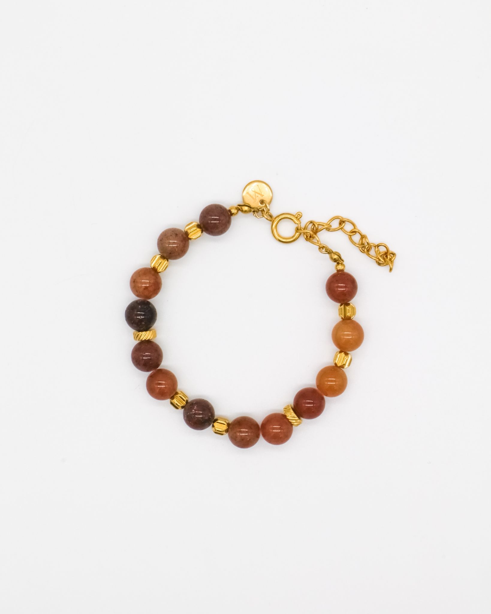 Pulseira com pedras frias com acabamentos e missangas em aço inoxidável.