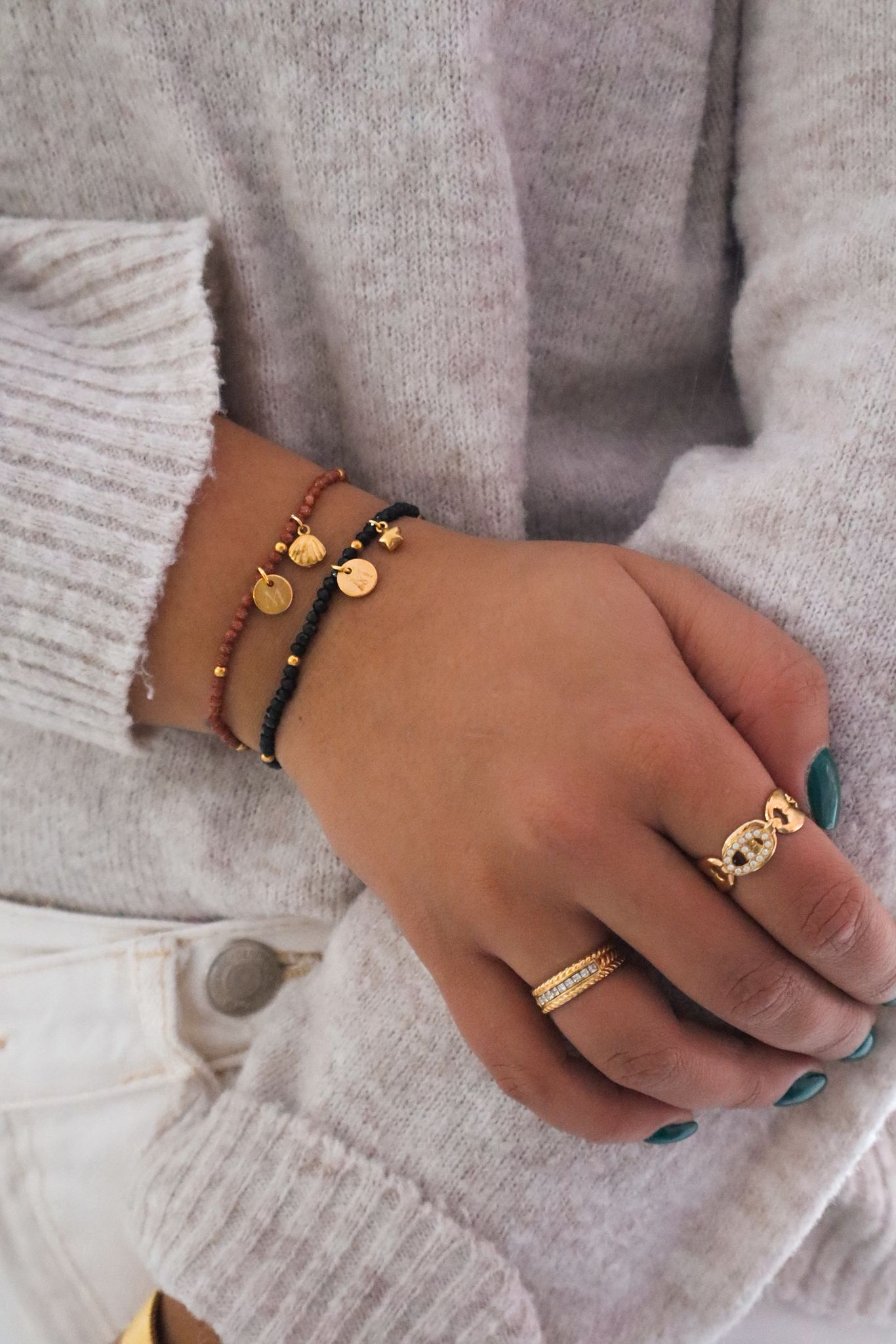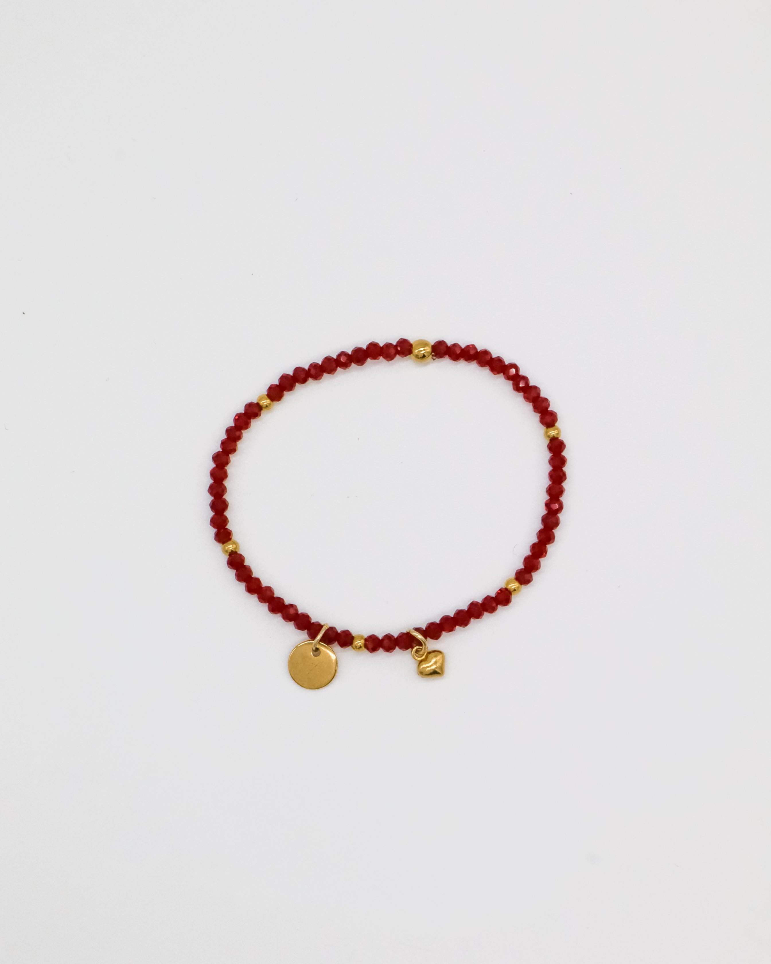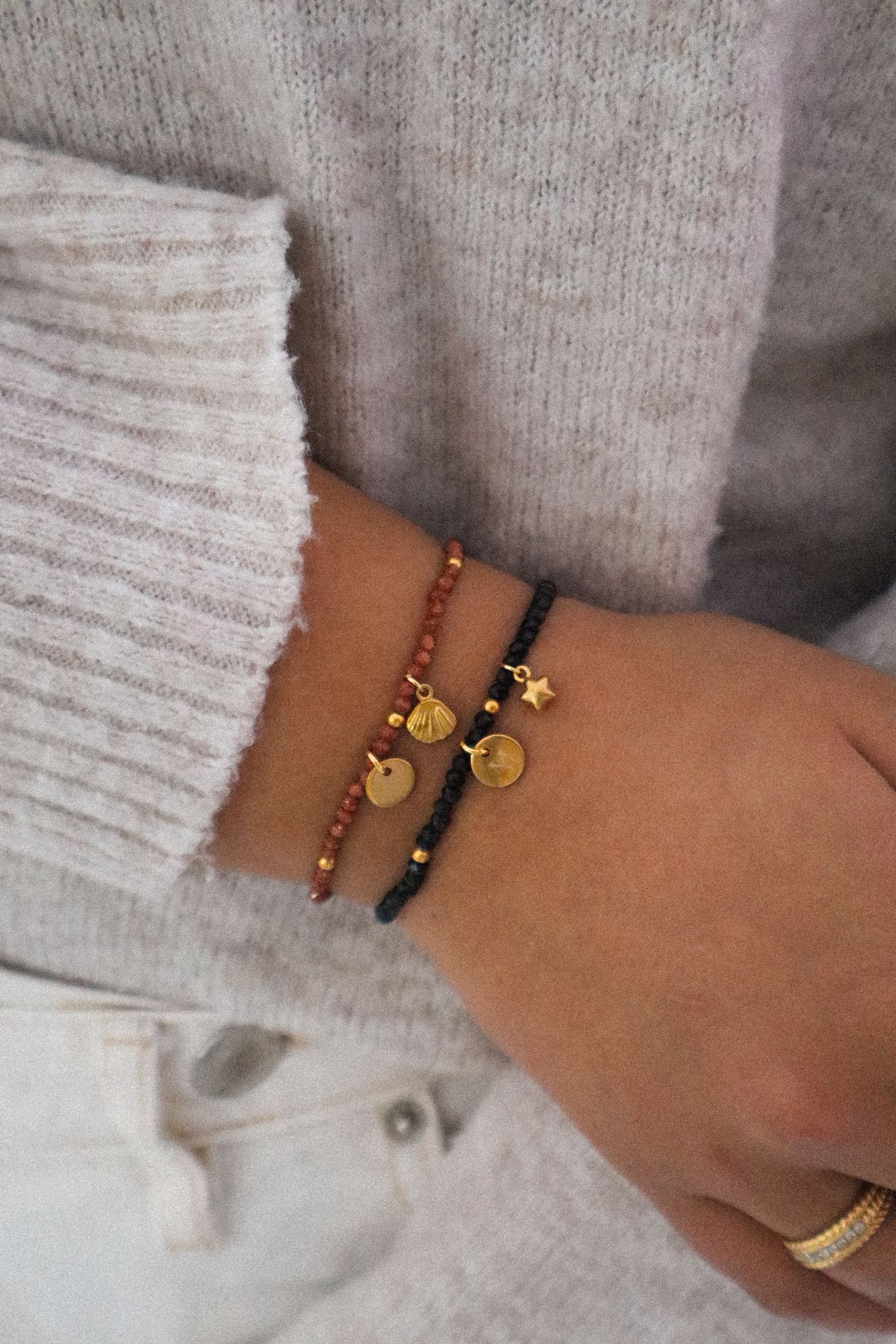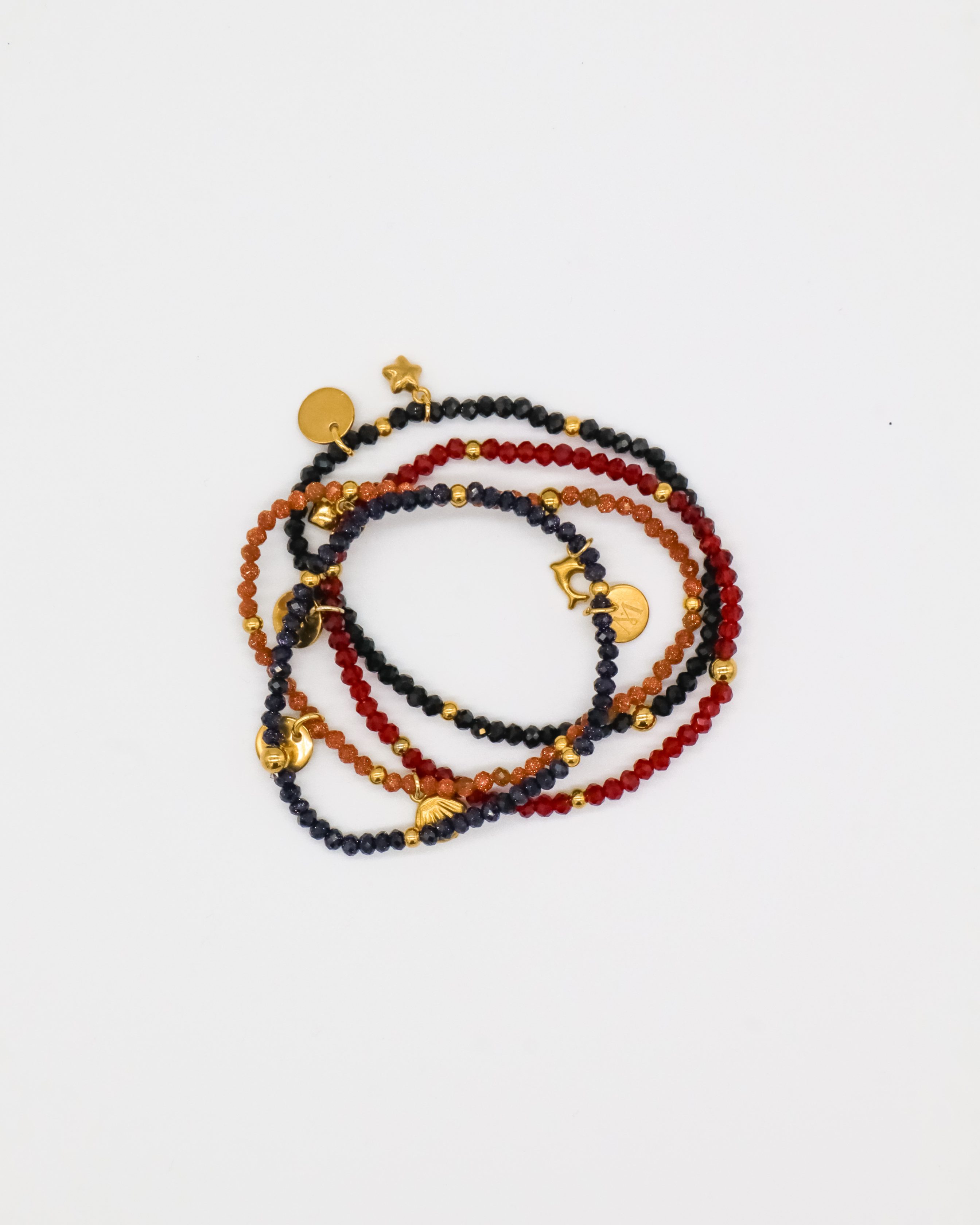 Pulseira em elástico com pedras semipreciosas, com acabamentos e pendentes em aço inoxidável.